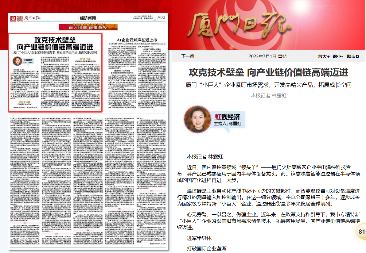 7月1日,《廈門(mén)日?qǐng)?bào)》在報(bào)道宇電新突破的頭條報(bào)道中提到,國(guó)內(nèi)溫控領(lǐng)域“領(lǐng)頭羊”宇電的產(chǎn)品已成熟應(yīng)用于國(guó)內(nèi)半導(dǎo)體設(shè)備龍頭廠商。這意味著智能溫控器在半導(dǎo)體領(lǐng)域的國(guó)產(chǎn)化進(jìn)程再進(jìn)一大步。以下是發(fā)表全文和版面:攻克技術(shù)壁壘 向產(chǎn)業(yè)鏈價(jià)值鏈高端邁進(jìn)廈門(mén)“小巨人”企業(yè)緊盯市場(chǎng)需求,開(kāi)發(fā)高精尖產(chǎn)品,拓展成長(zhǎng)空間本報(bào)記者 林露虹 近日,國(guó)內(nèi)溫控器領(lǐng)域“領(lǐng)頭羊”——廈門(mén)火炬高新區(qū)企業(yè)宇電溫控科技宣布,其產(chǎn)品已成熟應(yīng)用于國(guó)內(nèi)半導(dǎo)體設(shè)備龍頭廠商。這意味著智能溫控器在半導(dǎo)體領(lǐng)域的國(guó)產(chǎn)化進(jìn)程再進(jìn)一大步?! 乜仄魇枪I(yè)自動(dòng)化產(chǎn)線(xiàn)中必不可少的關(guān)鍵部件,而智能溫控器可對(duì)設(shè)備溫度進(jìn)行精準(zhǔn)的測(cè)量輸入和控制輸出。在這一細(xì)分領(lǐng)域,宇電公司深耕三十多年,逐步成長(zhǎng)為國(guó)家級(jí)專(zhuān)精特新“小巨人”企業(yè),溫控器出貨量多年來(lái)穩(wěn)居全球前列?! ⌒臒o(wú)旁騖、一以貫之、做強(qiáng)主業(yè)。近年來(lái),在政策支持和引導(dǎo)下,我市專(zhuān)精特新“小巨人”企業(yè)緊跟前沿市場(chǎng)需求儲(chǔ)