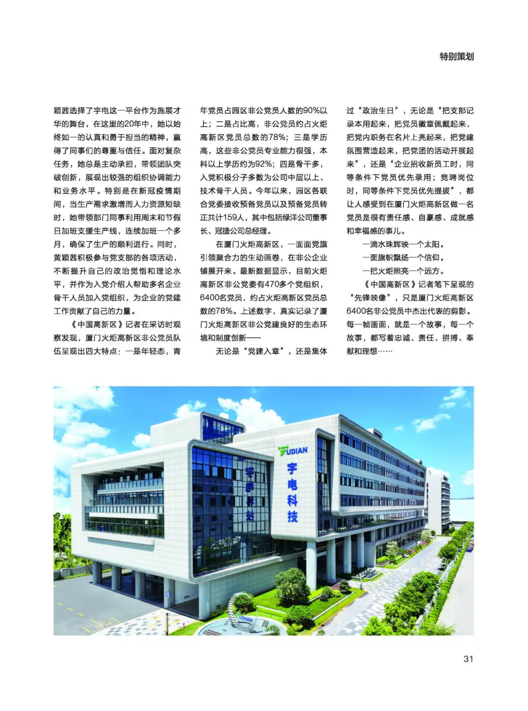 12月11日,《中國(guó)高新區(qū)》刊發(fā)《“火炬”新質(zhì)生產(chǎn)力的“先鋒映像”》的新聞報(bào)道,聚焦廈門火炬高新區(qū)非公黨員的杰出代表,其中宇電自動(dòng)化作為園區(qū)黨建工作優(yōu)秀企業(yè),得到了《中國(guó)高新區(qū)》雜志采訪肯定。